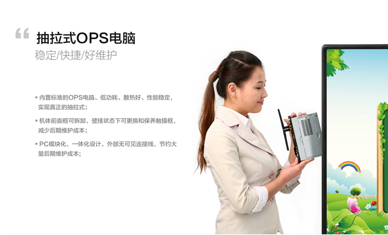 3、其雙系統(tǒng)觸摸一體機(jī)架構(gòu)核心采用鋁水鑄成,確保機(jī)器的安全、可靠、耐用等;