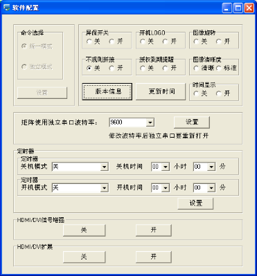 1、檢查拼接軟件的端口設置是否正確 2、檢查串口線是否有損壞,與產品和PC的接口是否接觸良好 3、檢查PC的串口是否有問題,可換一臺PC測試 4、拼接單元的地址是否設置正確,參見地址設置 |